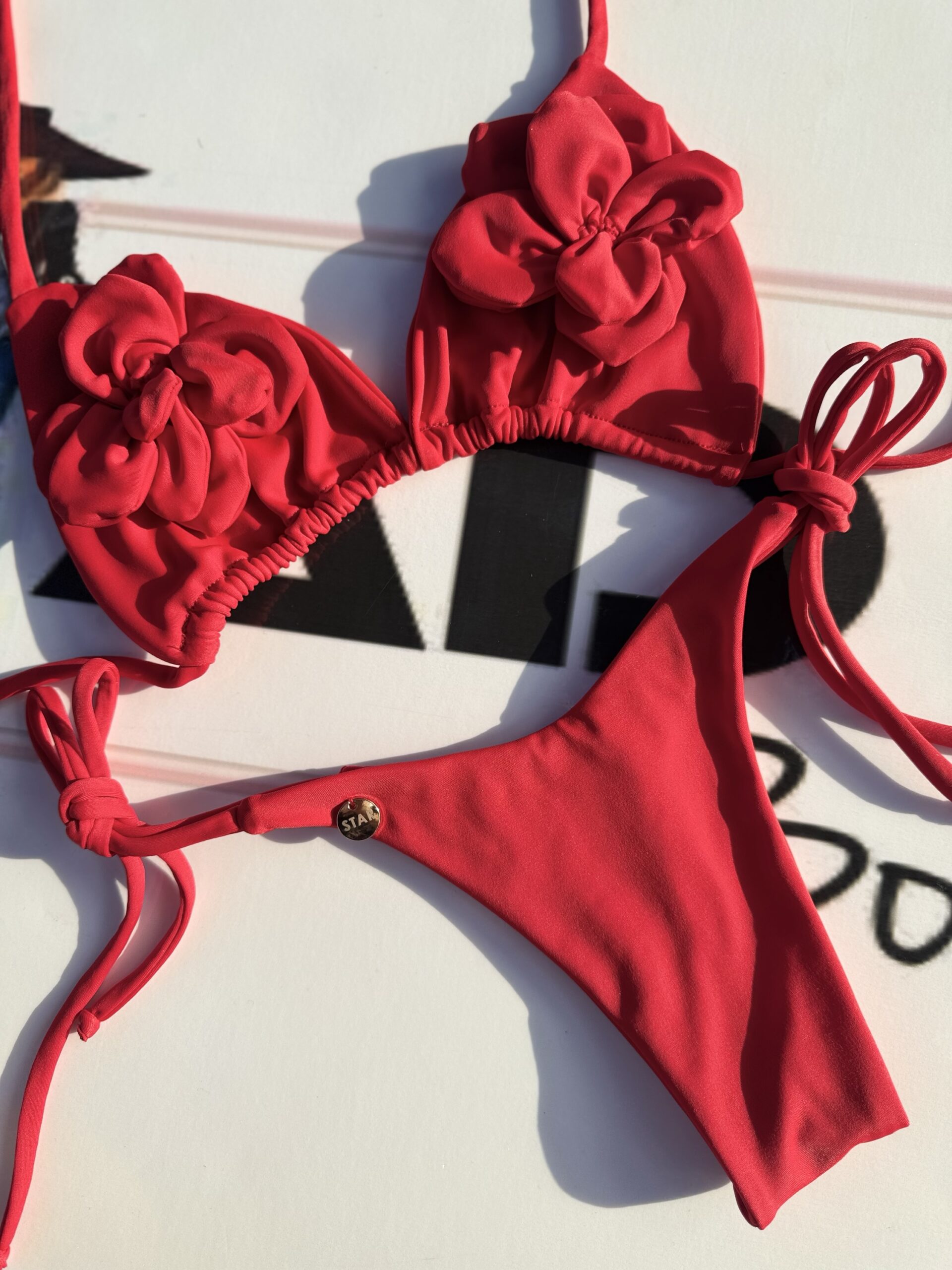 *Vibrant Red Bikini with Floral Details*