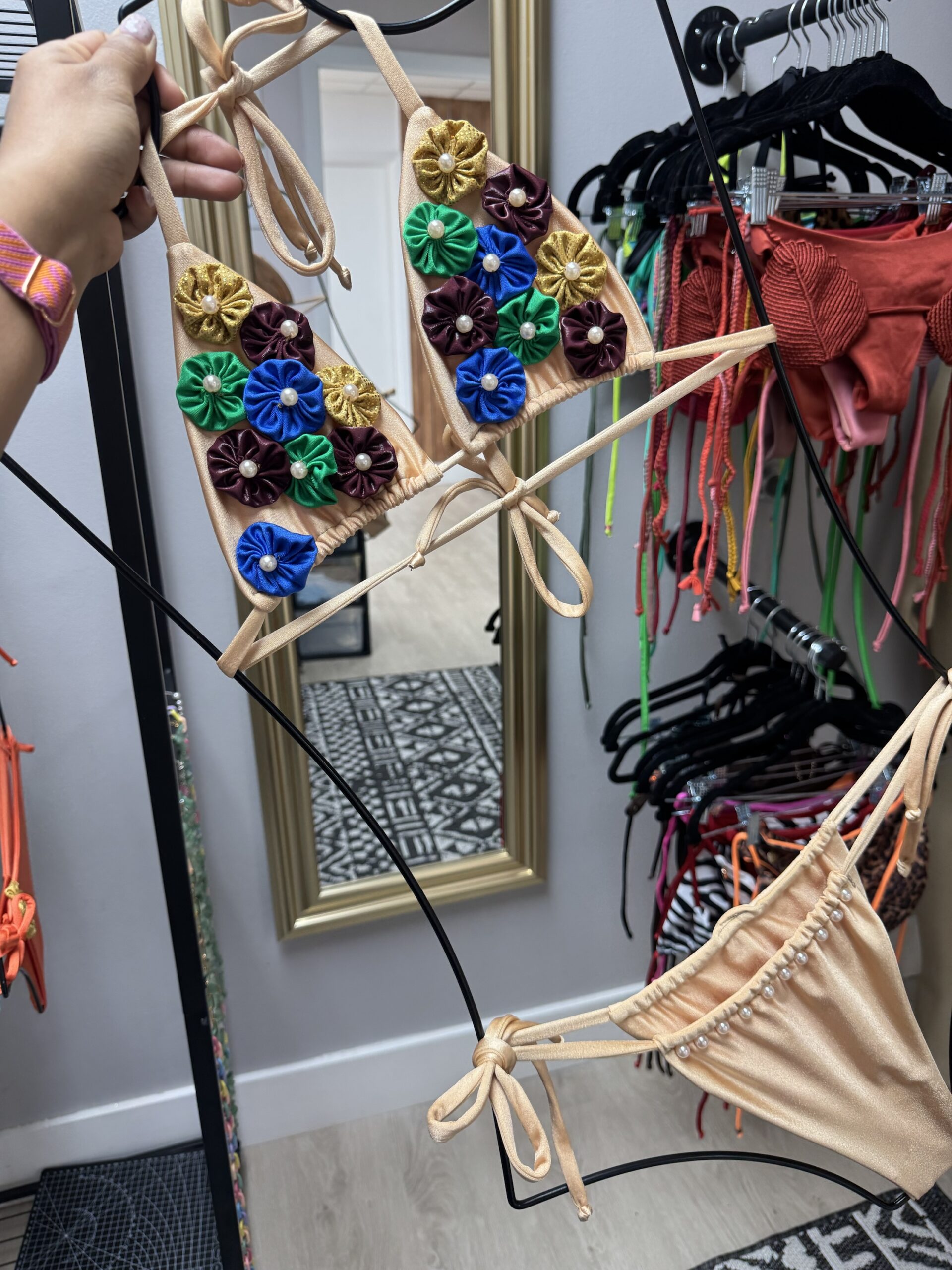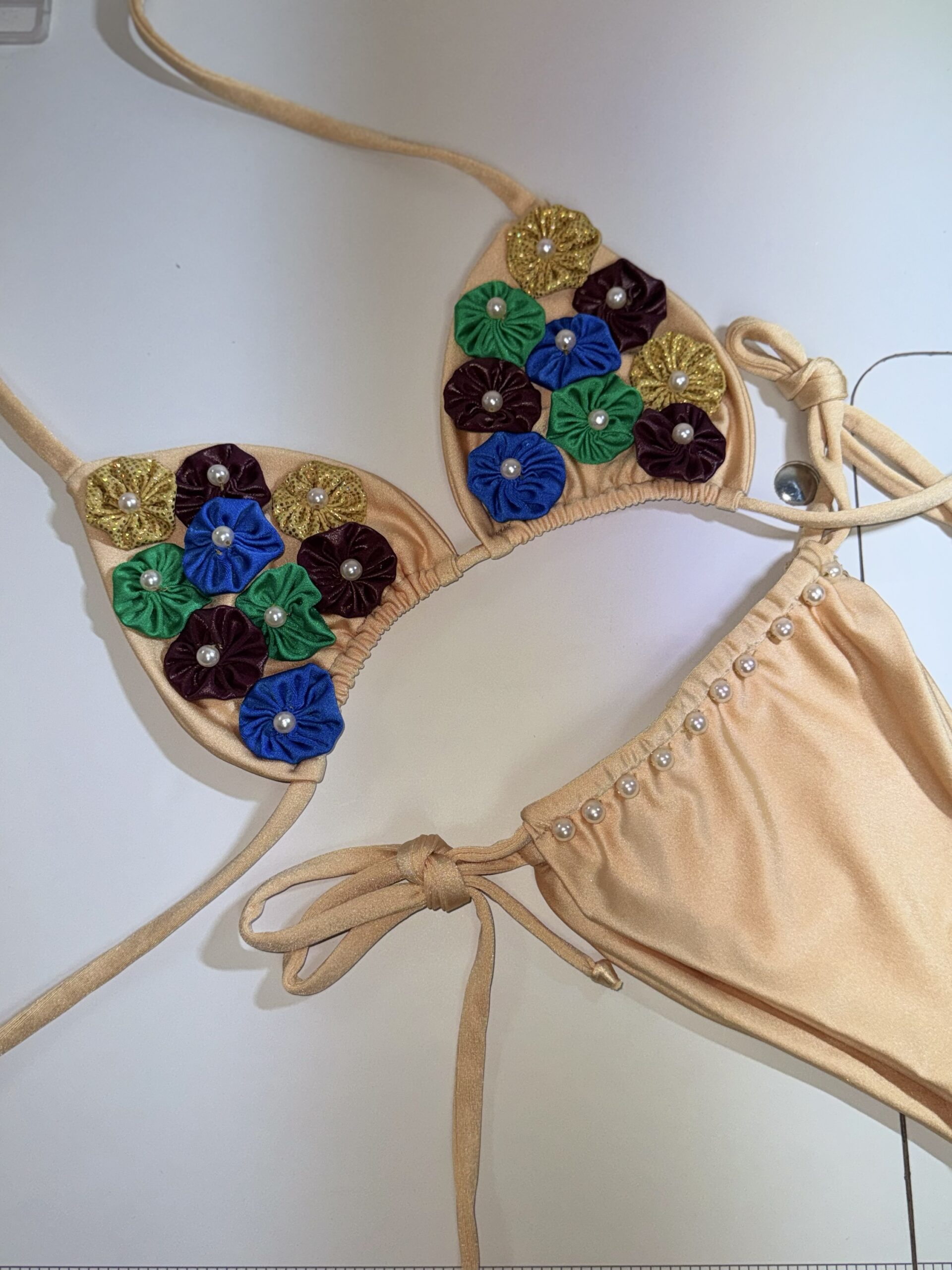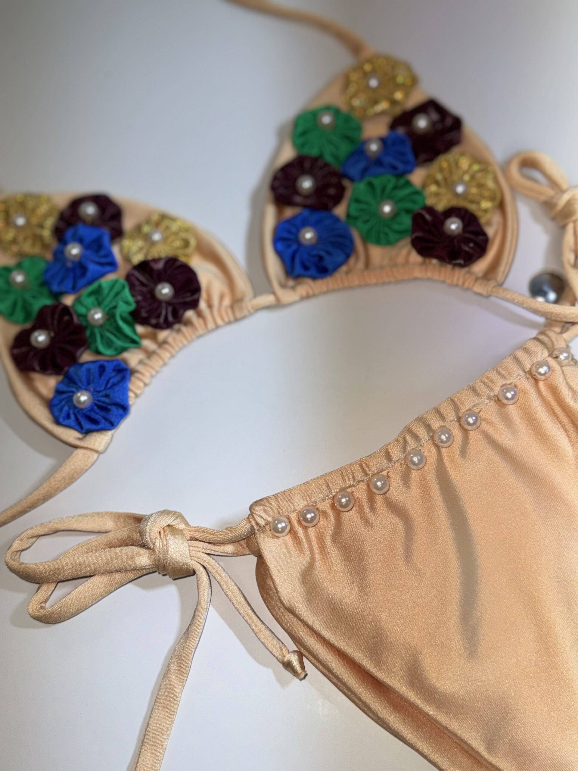 A delicate nude bikini elevated with handcrafted floral appliqués and pearl details. Designed to feel like a wearable piece of art, this exclusive design blends soft elegance with vibrant accents, creating a unique and feminine statement. Perfect for those who love luxury, detail, and standout beachwear.
