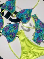 vibrant blue bikini with a tropical leaf pattern and neon green accents. The bikini top features thin straps and a gold ring in the center, while the bottoms have a high-cut design.