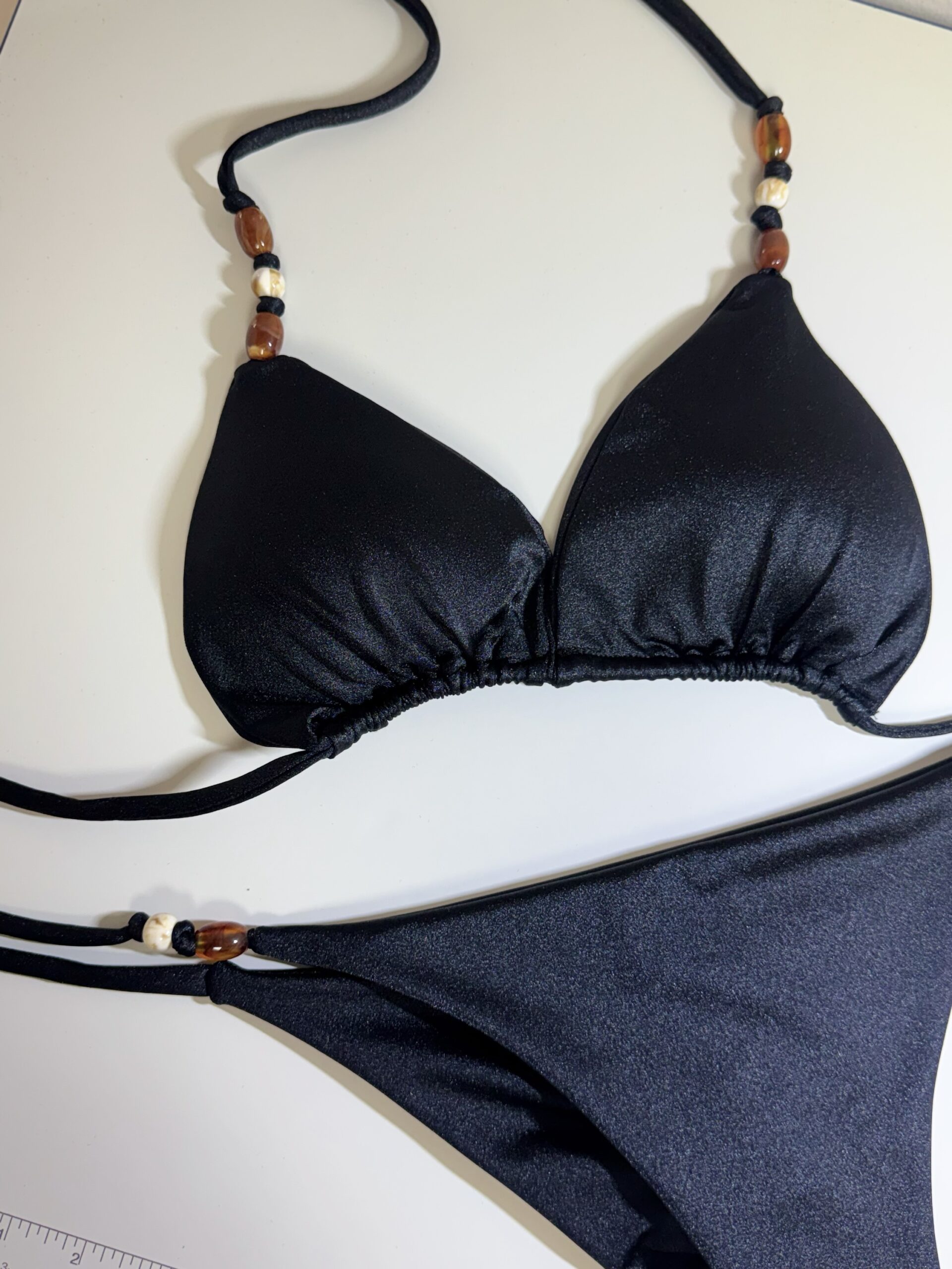 Delicate handcrafted bead accents add a subtle touch of artistry, elevating the piece into something truly special and exclusive. The adjustable triangle top allows for a customized fit, while the sleek bottom offers a smooth, sculpted look that hugs your body in all the right places.