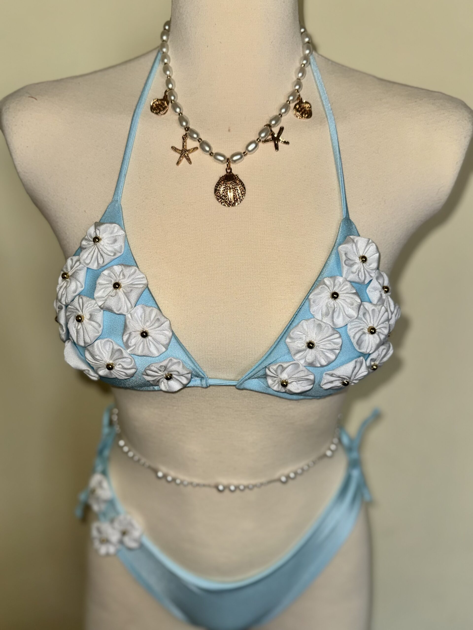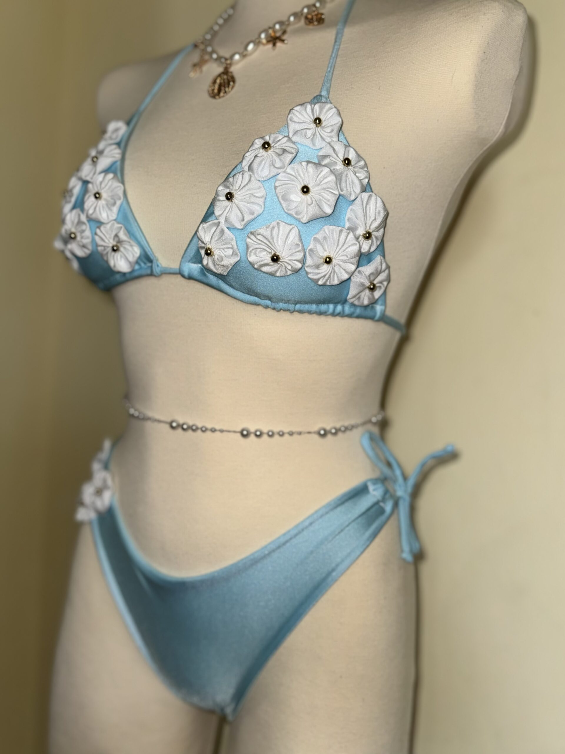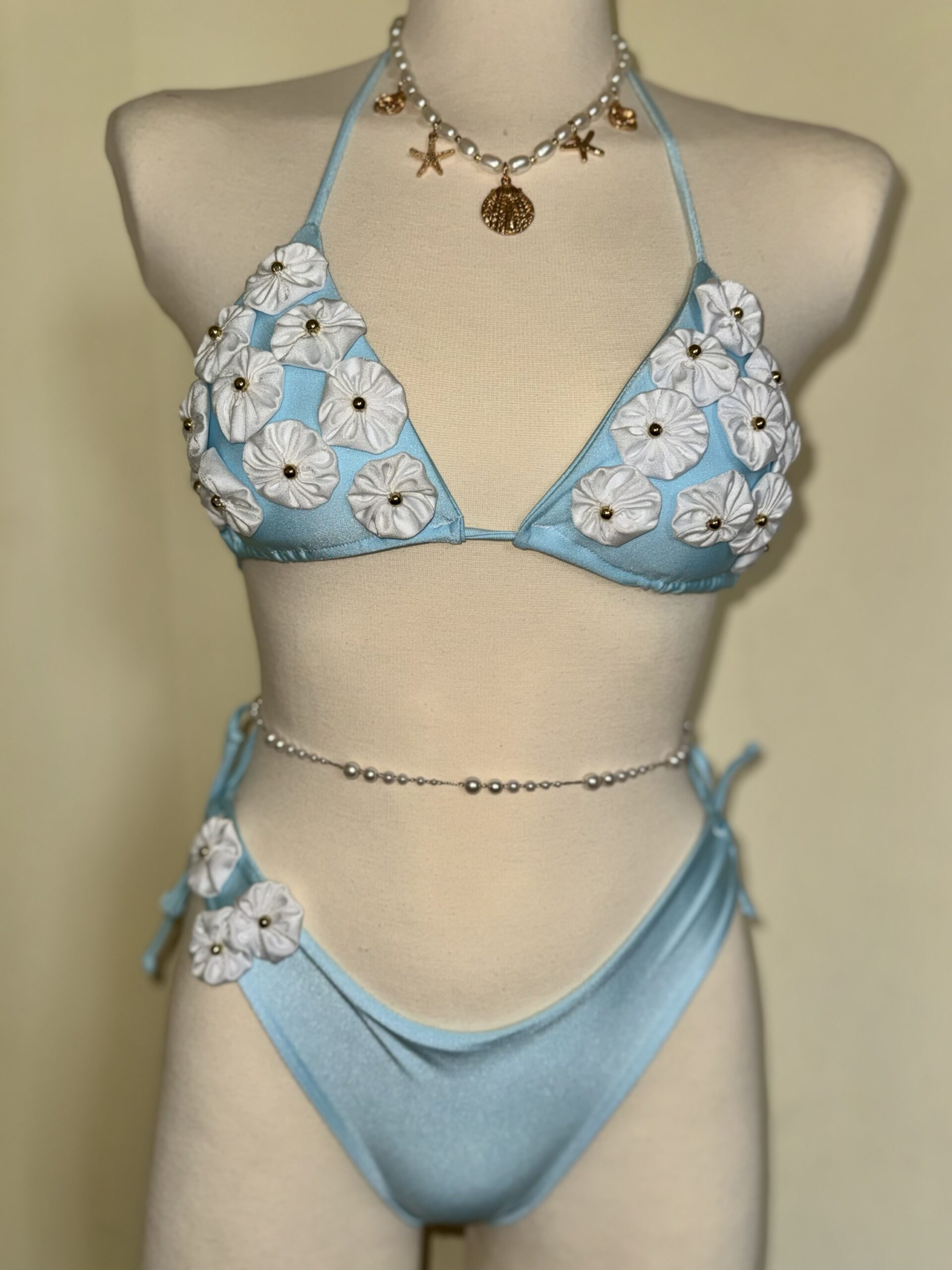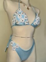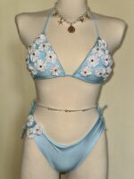A beautifully feminine bikini designed to capture the softness of seaside elegance. Crafted in a delicate sky-blue tone and adorned with handcrafted floral appliqués, this piece blends romantic charm with refined luxury. The subtle texture and sculpted silhouette create a graceful, flattering fit, while the dimensional blossoms add an effortlessly dreamy, resort-ready finish. Perfect for sun-soaked escapes, beachside elegance, and unforgettable summer moments.