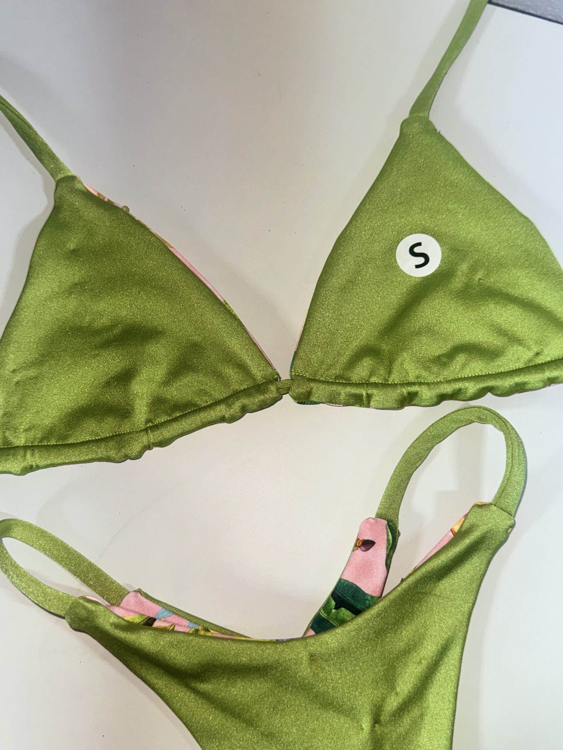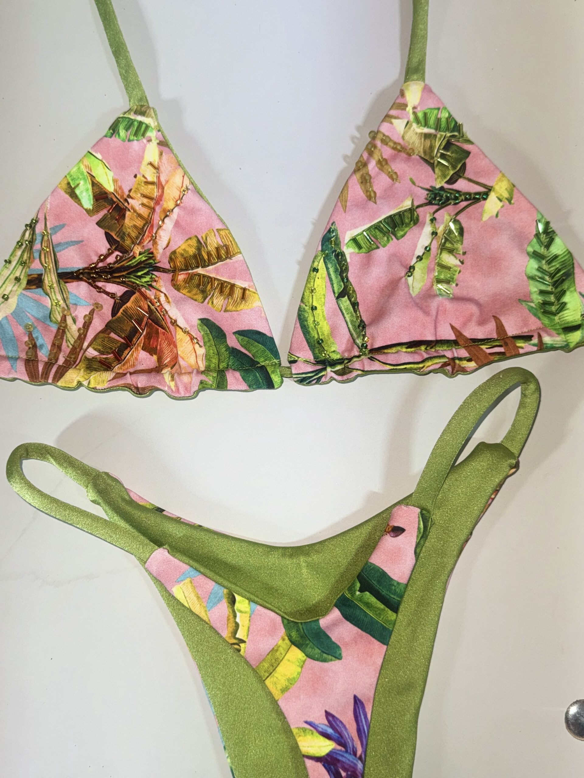 A statement piece designed for women who love exclusivity and effortless luxury. The Tropical Mirage Reversible Bikini features a vibrant tropical print on one side and a second versatile look on the other, giving you two stunning styles in one piece. Hand-finished with delicate beaded details, each embellishment is carefully placed to add a touch of artisanal elegance and sparkle. Crafted with premium fabrics for a flattering fit, soft feel, and lasting comfort, this bikini is made to make you feel confident, feminine, and unforgettable from every angle.